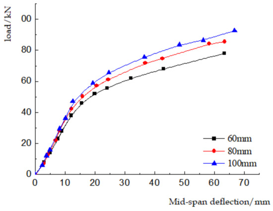 Under the condition that the screw spacing remains unchanged, the flange width of the laminated beam was set to 60 and 80 mm and mid-span load–deflection curves of different glulam flange widths were drawn, compared and analyzed, as shown in Figure 16.