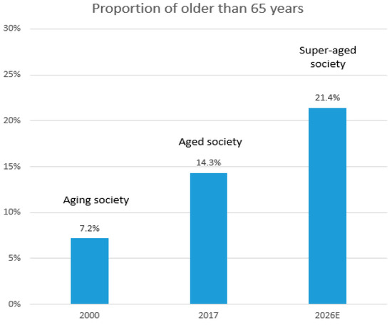 According to the United Nations, a country is classified as an “aging society” when more than 7% of its population is older than 65 years. When the percentage reaches over 14%, it is classified as an “aged society.” When more than 21% of the population is older than 65, the country is referred to as a “super- or hyper-aged society” [2]. According to the Korea National Statistics Office, Korea became an aging country in 2000 by having 7.2% of its population older than 65 years, and then became an aged society in 2017 by having 14.3% of its population older than 65 years. In addition, it is expected to become a super-aged country by 2026 with an estimated 21.4% of its population aged over 65 years [1] as shown in Figure 1.
