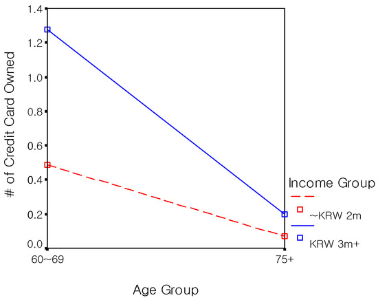 The possibility of an interaction effect between age and income was further examined using ANOVA. It was expected that among those with high incomes, credit card ownership and usage would show little variance with age, since income enables the elderly to own more credit cards and to purchase more goods and services. However, among those with lower incomes, variations with age in both credit card ownership and usage were expected, as limited income may suppress credit card ownership and purchases.