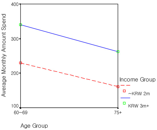Second, the results of the amounts charged using credit cards showed a significant main effect of income only (F = 6.81, p < 0.05). The main effect of age and the interaction effect were not significant (F = 3.24, p = 0.08 and F = 0.01, p = 0.91, respectively). These findings suggest that income is the main factor that produces differences in the amounts charged using credit cards for elderly consumers.