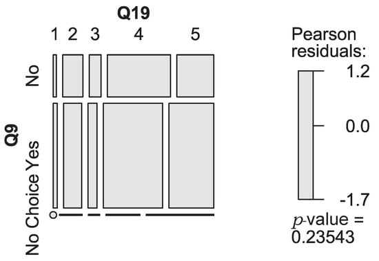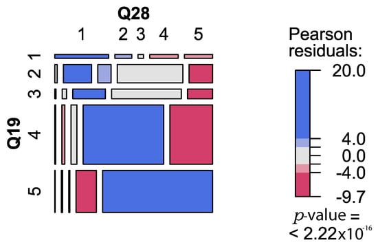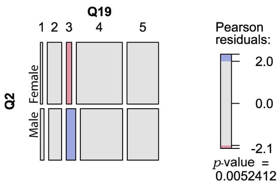 Here, it can be observed that the residuals assuming no relationship between the variables in the model are small. Thus, the model definitively shows no relationship between variables based on the data. The only statistically significant relationship is the relationship between gender and question 19. However, as shown in Table 4 and Figure 2 (the corresponding mosaic plot), this relationship is weak.