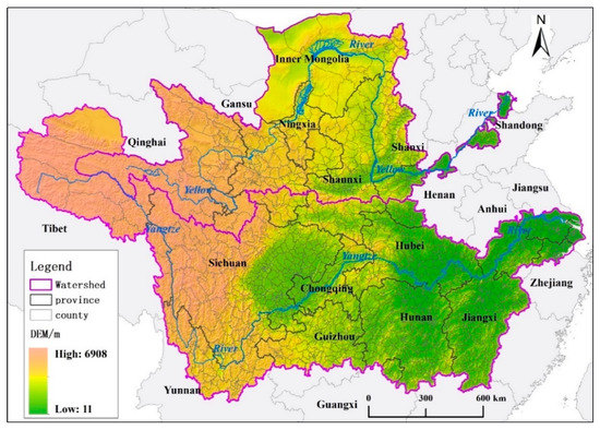 The topography of the two basins has a similar pattern; they both decrease in elevation from west to east, with their western part located on the rim of the Qinghai–Tibet Plateau. The northern part of the Yellow River Basin is located on the Inner Mongolia Plateau, and its middle part is located on the Loess Plateau, whereas the Shandong and Henan provinces in the eastern part of the basin consist of plains with lower elevations. With a temperate monsoonal climate and temperate continental climate as the main climate types, the Yellow River Basin features significant variation in annual precipitation, with the maximum rainfall exceeding 1000 mm and the minimum rainfall being lower than 100 mm. The western part of the Yangtze River Basin is located on the eastern rim of the Qinghai–Tibet Plateau with a maximum altitude of approximately 6908 m, and the southwestern region and the surrounding area of the Sichuan Basin are also higher in elevation. On the other hand, most of its central and eastern parts consist of lower hilly areas or plains. The climate types of the Yangtze River Basin are mainly a subtropical monsoonal climate and alpine climate, where the precipitation is higher than that in the Yellow River Basin, with the maximum rainfall exceeding 2000 mm and the minimum being lower than 400 mm.