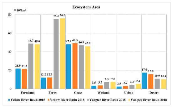 Due to the relatively small changes in the area of the ecosystems between adjacent years, this study conducted a comparative analysis of only the ecosystem patterns in 2015 and 2018. As illustrated in Figure 2, there were large differences in the patterns of the ecosystems in the two basins. The grassland ecosystem in the Yellow River Basin had the largest area, accounting for more than 45%, while the forest ecosystem area accounted for less than 12%. However, the area of the forest ecosystem in the Yangtze River Basin was significantly higher than the other types, reaching 760,000 km2 in 2018 and accounting for approximately 39% of the area, and the areas of the farmland and grassland ecosystems were similar, accounting for approximately 25%. A comparison between the two basins showed that, except for the grassland and desert ecosystems, the area of the other ecosystems in the Yangtze River Basin exceeded that of the Yellow River Basin, especially farmland and forest, whose areas were approximately twice and six times those in the Yellow River Basin, respectively. From 2015 to 2018, all ecosystem areas, except for the areas of farmland and desert, increased in the Yellow River Basin, with the grassland area increasing by 13,000 km2, urban area increasing by 7000 km2, and desert area decreasing by 17,000 km2. The Yangtze River Basin saw an increase in the urban and forest areas by 11,000 km2 and 8000 km2, respectively, and a decrease in the farmland and grassland areas by 7000 km2 and 9000 km2, respectively.