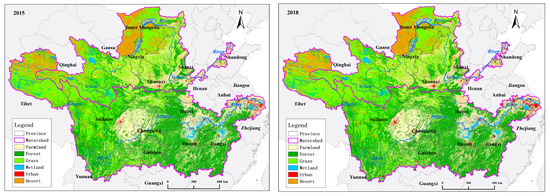 Spatially (Figure 3), the farmland in the Yellow River Basin is relatively concentrated, with the majority of farmland located in the Fen-wei Plain and along the banks of the Yellow River in the Henan and Shandong provinces. Farmland and grassland are interlaced in Shaanxi, Gansu, and part of Ningxia in the northwestern part of the Fen-wei Plain, whereas Inner Mongolia and parts of Qinghai are dominated by grassland. The forest is distributed in a more scattered pattern, mainly in the Qilian Mountains, along the Fen River Basin and in the western part of Henan province. The farmland of the Yangtze River Basin is mainly distributed in the Sichuan Basin, the central part of Hubei downstream of the Yangtze River, the border between Henan and Hubei, and the Jiangsu and Zhejiang provinces. The forest is present in the entire basin, especially in the middle and lower reaches. The grassland is mainly distributed in the northwestern part of Sichuan province and the southern part of Qinghai province. A comparison of the spatial distribution between the two basins showed that the distribution of farmland and forest is on a much wider scale in the Yangtze River Basin than that in the Yellow River Basin, whereas the distribution of grassland and desert is relatively wider in the Yellow River Basin than in the Yangtze River Basin. From 2015 to 2018, the scope of the urban ecosystem visibly expanded in the study area. The western portion of the Yellow River Basin experienced a massive conversion of desert to grassland, and parts of the grassland in the central and western portions of the Yangtze River Basin were converted to forest. Spatial changes were nonsignificant for the other ecosystems.