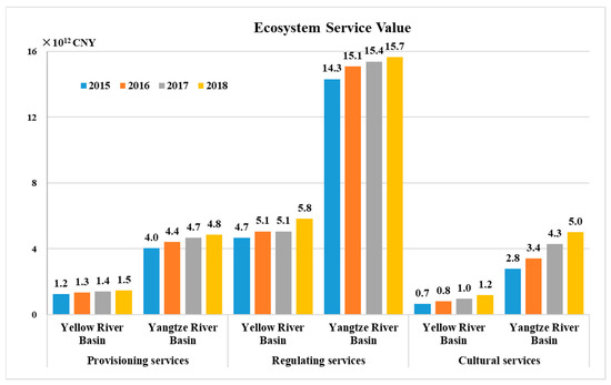 The values of different services were accounted for based on the ecosystem service value accounting models. As illustrated in Figure 4, the regulating service values in both basins were higher than the other two service values, exceeding the aggregate of the provisioning and cultural service values. The total ecosystem service values of the Yangtze River Basin from 2015 to 2018 (which were CNY 21.3 trillion, CNY 23.0 trillion, CNY 24.5 trillion, and CNY 25.7 trillion) were higher than those of the Yellow River Basin (which were CNY 6.6 trillion, CNY 7.2 trillion, CNY 7.4 trillion, and CNY 8.5 trillion), and the regulating service value was significantly higher than that of the Yellow River Basin, producing CNY 15.7 trillion and CNY 5.8 trillion, respectively, in 2018. The ecosystem service values increased between 2015 and 2018 for both basins, of which the increment and growth rate of the cultural service value outpaced the provisioning and regulating service values, reflecting the positive results in the transformation of ecological cultural services in both basins. The increment of the regulating service value in the Yangtze River Basin was higher than that in the Yellow River Basin, but the growth rate was outperformed by that in the Yellow River Basin. A comparison of the value per unit area showed that the total value of various services in the Yangtze River Basin was 13.3 million CNY/km2 higher than that in the Yellow River Basin, which was 8.0 million CNY/km2 in 2018. The regulating service value per unit area exceeded that of the provisioning and cultural services in both basins. Among the various services, only the value per unit area of sand fixing was higher in the Yellow River Basin than in the Yangtze River Basin.