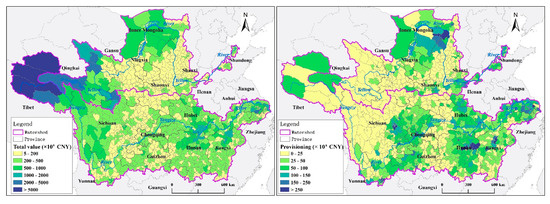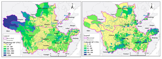 Spatially, the county-level administrative district was used as the statistical unit. Figure 5 shows that the ecosystem service value was generally higher in the west than in the east, with the central part having the lowest value. The counties of Yushu, which is located at the source of both the Yellow River and the Yangtze River, had the highest value. The total value was similar to the spatial distribution of the regulating service value. In the middle and upper streams of the Yangtze River, certain spatial complementarity manifested between the regulating service and the provisioning and culturing service values. For example, the Sichuan Basin is an important agricultural zone with a strong product supply capacity and is a heavily populated region with a more developed economy and eco-cultural tourism industry. Hence, it is endowed with a high cultural service value, but its regulating service capacity is lower than that of the surrounding regions due to the comparatively insignificant presence of ecosystems such as forests, grasslands, and wetlands.