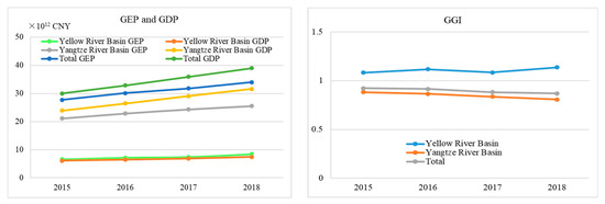 Regional economic development and the surrounding eco-environment are mutually influential. The following analysis adopted the GDP and gross ecosystem product (GEP) [4] as quantitative indicators to represent economic development and ecological environment quality, respectively. Figure 7 shows an increase in GDP and GEP in both river basins from 2015 to 2018, indicating the improvement in eco-environment quality while maintaining economic growth. The positive effects of eco-environmental protection policies and measures in recent years have shaped a basically healthy trend of synergetic development between the economy and environment in China. The ratio of GEP to GDP, named the GGI, is used to measure the complementarity between regional eco-environmental protection and economic development. Figure 7 shows that the GGI in the Yellow River Basin was above 1 with the curve deviating from 1, indicating that the degree and rate of ecological improvement decoupled from economic growth and that the economic potential of the eco-environment had not been fully tapped. The Yangtze River Basin, on the other hand, features a more developed and faster growing economy, with a GDP higher than the ecosystem service value and a GGI below 1, causing concern over the potential for ecological safety to be threatened by economic development.