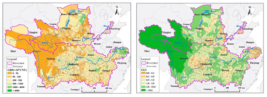 Figure 8 illustrates the spatial distribution of GDP and GGI in the two basins in 2018. Spatially, the Yangtze River Basin contained more counties with higher GDPs than the Yellow River Basin. Fifty-one percent of the counties had their own GGIs above 1, and 58 of them had a GGI above 10, most of which were in the west part of Sichuan and Qinghai. These areas should explore the value methods of ecological products in the future to achieve synergy between ecological conservation and economic growth. Regions where the GDP exceeded the ecosystem service value (i.e., a GGI below 1) were distributed around the Yangtze River Delta, Changsha-Zhuzhou-Xiangtan, Sichuan, Chongqing, Fen-wei Plain, and downstream of the Yellow River.