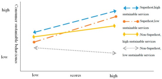 In order to test the interactive effects of the super hosts and homeowners providing sustainable services and scores, the second-order and third-order interaction terms of the above three variables were added to the regression equation. Model 3 showed that the third-order interaction item of super_host × sustainable_services × review_score had a significant positive impact on sustainable consumption behavior (β = 0.345, p < 0.05), assuming H4 was supported. When the property was “super_host × sustainable_services”, high scores had the strongest positive impact on customer sustainable consumption behaviors; when “non-super_host × low sustainable services” were considered, the review score had a negative impact on sustainable consumption behaviors, and the interactive effects of the three were analyzed, as shown in Figure 2.