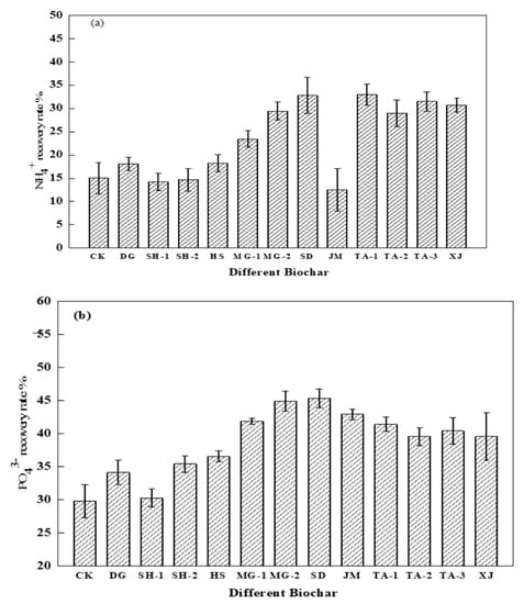 Effects of biochar types on ammonium and phosphorus recovery: (a) ammonium recovery efficiency and (b) phosphorus recovery efficiency.