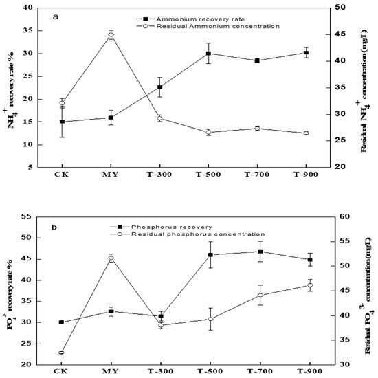 The removal efficiency of NH4+ increased with higher temperatures. The removal efficiencies of NH4+ were 15.03%, 15.92%, 22.61%, 30.03%, 28.44%, and 30.19% at control CK, MY, T300, T500, T700, and T900, respectively. The residual removal efficiencies of ammonium were 32.11%, 44.97%, 29.25%, 26.60%, 27.32%, and 26.44% at control CK, MY, T300, T500, T700, and T900, respectively (Figure 2a). Similarly, the removal efficiency of P increased at 700 °C and decreased at 900 °C. With a rise in temperature, the P removal efficiencies were 30.09%, 32.65, 31.51%, 46.01%, and 46.79% before decreasing to 44.87% under control CK, MY, T300, T500, T700, and T900, respectively. The residual removal efficiencies of P were 32.50%, 51.67%, 38.02%, 39.30%, 44.11%, and 46.14% at control CK, MY, T300, T500, T700, and T900 (Figure 2b). After adding it to the simulated biogas slurry, the initial phosphorus and ammonia nitrogen concentrations in the biogas slurry increased, while the magnesium ion concentration was not affected.