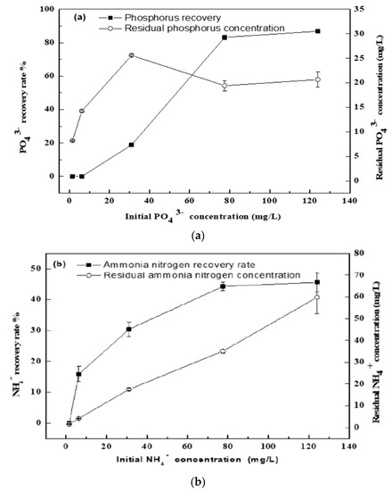 Effects of initial phosphorus concentration on phosphate recovery, ammonium recovery, and their residual concentrations using the struvite precipitation method: (a) phosphorus recovery efficiency and (b) ammonium recovery efficiency.