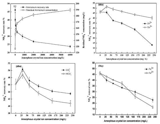 Effects of ions on ammonium recovery: (a) K+, (b,c) Zn2+ and Cu2+, (d,e) CO32− and HCO3−, (f,g) Fe3+ and Fe2+.