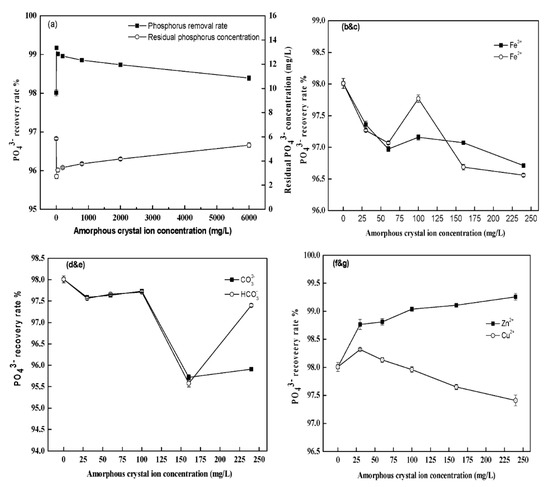 Effects of ions on phosphate recovery: (a) K+, (b,c) Fe3+ and Fe2+, (d,e) CO32− and HCO3−, and (f,g) Zn2+ and Cu2+.
