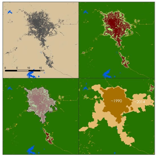 Urban built-up pixels and their urbanized open space comprise urban clusters. For a given analysis area, we identified all urban clusters; there could be as few as one or several hundred. We then applied an “inclusion rule” to determine which urban clusters would be unioned into the same urban extent. The inclusion rule creates a catchment area around individual urban clusters based on the amount of built-up area within them. Clusters with overlapping catchment areas were unioned and labeled with the name associated with the principal urban cluster. This mapping exercise was repeated at three time periods: circa 1990, circa 2000, and circa 2014. A discussion of the inclusion rule and its application is described in [] (pp. 12–14). For the present analysis, we rely on data for circa 1990 and circa 2014 only. Superimposing the two urban extents of a city over each other, we created maps that show (1) their 1990 footprint: the area built until 1990, and (2) their expansion area: the area added between 1990 and 2014 (Figure 2).