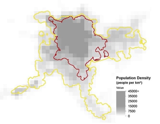 - Schiavina, M.; Freire, S.; MacManus, K. GHS Population Grid Multitemporal (1975, 1990, 2000, 2015) R2019A; European Commission, Joint Research Centre (JRC): Ispra, Italy, 2019; Available online: http://data.europa.eu/89h/0c6b9751-a71f-4062-830b-43c9f432370f (accessed on 1 February 2021). [CrossRef]