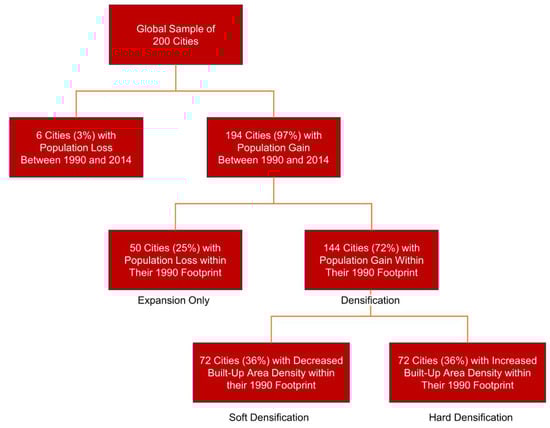 There are several possible scenarios: the city as a whole may have gained (or lost) population during this period. The 1990 footprint may have gained (or lost) a share of that population gain (or loss). Note that the area of the 1990 urban extent did not change at all between 1990 and 2014, only its population changed. According to Equation (1), if its population grew, its urban density increased. This increase in urban density was accompanied either by an increase in saturation, an increase in built-up area density, or by an increase in both. This suggests that cities may fall into different categories pertaining to the densification of their 1990 urban footprints and that cities in some categories may be more amenable to overall densification than others. The classification of the 200 cities in the global sample into these categories is summarized in Figure 5.