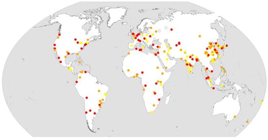Map showing the geographic distribution of cities in the four exclusive categories identified in Figure 6, Figure 7, Figure 8 and Figure 9: cities that lost population (white), 50 cities with population gain that lost population within their 1990 footprint (yellow), 72 cities with “saturation only” densification of their 1990 footprint (red), and 72 cities with “hard densification” of their 1990 footprint (orange).