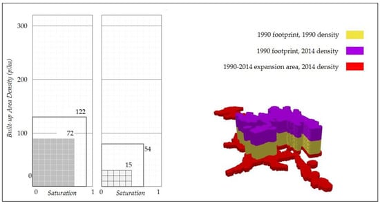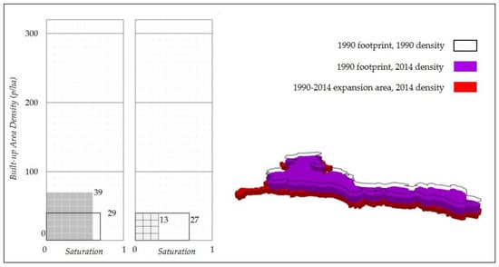 In the two graphs on the left of Figure 7, saturation is shown on the X-axis, varying from 0 to 1, and built-up area density is shown in persons per hectare on the Y-axis, varying from 0 to 320 p/ha. In the graph on the left, we see urban density within its 1990 footprint in 1990 (dark grey rectangle) and in 2014 (thick border rectangle). The changing shape of the urban density rectangle tells us that built-up area density decreased during this period (from 70 to 40 p/ha), while saturation increased (from 0.6 to 0.7). In the graph on the right, we see urban density in its expansion area (light grey rectangle) and in the city as a whole (double line border rectangle) in 2014. The smaller size of the light grey rectangle, in comparison with the dark grey one on the left, tells us that overall urban density in the new expansion areas was lower than that of the 1990 urban footprint. The lower height of the light grey triangle tells us that it was smaller because of lower built-up area density, and not because of lower saturation levels. The double-line border rectangle tells us that overall urban density in the city in 2014 was lower than that 1990 (dark grey rectangle on left) because of lower built-up area density, not because of lower saturation.