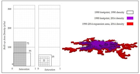 The large majority of cities in this group followed the same pattern as that of Berlin, but not all of them. Twelve cities in this group followed a slightly different pattern: their expansion areas were built at a higher built-up area density than that of their 1990 footprints. Theories of the urban land market—such as those propounded by [,,]—expect density to decline with distance from the city center. In Ahvaz, Iran, for example, built-up area density within its 1990 footprint declined from 100 to 70 p/ha between 1990 and 2014, while built-up area density within its newly built expansion areas averaged 130 p/ha in 2014. Still, because saturation levels on the new urban periphery were low (0.4), overall urban density in these areas in 2014 was still lower than urban density within the 1990 footprint, resulting in the decline in urban density in the city as a whole, from 71 p/ha in 1990 to 62 p/ha by 2014. This pattern was common to 11 out of the 12 cities in this category. The only exception was Singapore. As its 1990 footprint lost population during the 1990–2014 period, urban density within its 1990 footprint declined, like all cities in this group. However, its new expansion areas were built at a higher built-up area density and at a higher level of saturation, with the astonishing result that the urban density in the expansion area of the city in 2014 was more than double the urban density within its 1990 footprint in that year (219 p/ha vs. 82 p/ha). As a result, overall urban density in Singapore increased from 90 to 121 p/ha, at the average rate of 1.2% per annum.