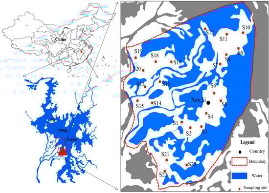 Nanjishan wetland area, as a National Wetland Nature Reserve, is located at the south of Poyang lake with an important role in maintaining the ecological security of the local area. Nanjishan wetland is not only a traditional functional wetland but also has a unique wetland ecosystem due to the interactions of hydrology, biology, and vegetation. Thus, it is considered as a reservoir with the function of removing pollutants; simultaneously, it is crucial to maintaining the habitat for wintering water birds [25,26,27].