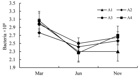 Qualitative analysis of the effect of microorganisms on soil nutrients is arduous due to the highly sophisticated natural factors and anthropic factor [33]. We analyzed the biological characteristics of the soil in wetlands from a quantitative angle. The distribution and change in the number of bacteria can be seen in Figure 3. Based on the experimental results, the bacteria in the soil were recorded with the highest quantity, its average ranges were 1.7 − 4.0 × 106 cfu/g in Mar, 1.3 − 3.6 × 106 cfu/g in Jun, and 1.4 − 3.1 × 106 cfu/g in Nov.