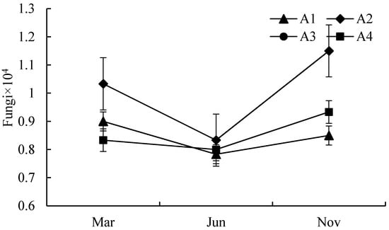 The distribution and change in the number of Actinomycetes can be seen in Figure 5. The quantity of actinomycetes in soil is close to that of bacteria, although the actinomycetes abundance is small, but the biomass in soil is almost the same as bacteria. The secretion of Cytokinin promotes the growth of crops, and has the role in disease prevention against Zhuang bacteria. The numbers of the soil actinomycetes were in the range of 0.90–1.9 × 105 CFU/G in Mar, 0.8–1.5 × 105 CFU/G in Jun, and 0.6–1.6 × 105 CFU G in Nov. The difference of biomass in the four areas was not significant. The change trend of actinomycetes in different periods was consistent with that of bacteria. In this study, the number of actinomycetes in A1 in June and November was lower compared to other regions, and this may be owing to agricultural and fishery activities.