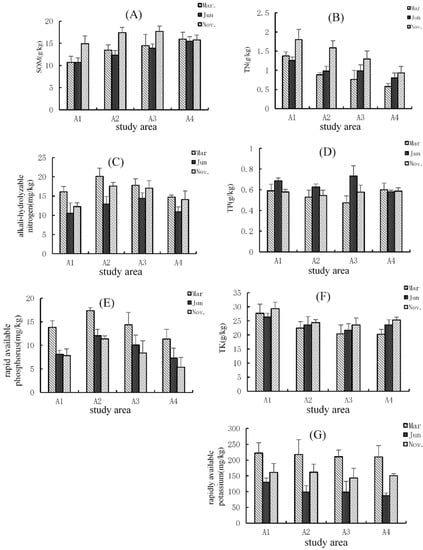 The results showed less significant spatial heterogeneity in the SOM among sampling areas except in Mar (Figure 6A). The average concentrations (ranges) of the SOM in Mar, Jun, and Nov were 13.4 g kg−1 (8.65–17.90 g kg−1), 12.86 g kg−1 (7.28–17.44 g kg−1), and 16.63 g kg−1 (10.16–19.87 g kg−1), respectively. During Mar, the highest average value (15.9 g kg−1) was recorded at A4 due to the lower amount of human activities and large amount of vegetation., this is consistent with Paul et al. (2016) and Haynes et al. (2005), plant detritus was an important component of the SOM [35,36].