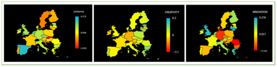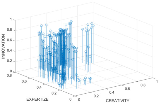 Changing the point of view, a strong relationship was found between IQ, as a measurement of intelligence, and economic growth, in [45,46]. In [47], intelligence, also measured by IQ, has a positive effect over innovation. Nusbaum, found a more significant connection between the two cognitional dimensions and stated that “creativity and intelligence are more strongly connected that conventional thoughts relate” [48]. Jacobs sustained that the main source that generates innovation is the knowledge transfer between sectors [49]. Consisting, in [50] was conducted an empirical research on the effect that geographical knowledge spillovers have on the level of innovation and was found a positive relationship among them. In the same research, a positive relation was found between the level of innovation and local universities, and disinterested basic research. Lee, Florida and Gates found positive relationships among creativity, diversity and innovation [51]. Moreover, in [52], Knudsen et al. found strong correlations among geographical areas where the percentage of creative class workforce was high and innovative performance of that areas, showing that the percentage of creative class workforce had direct implications on the level of innovation.