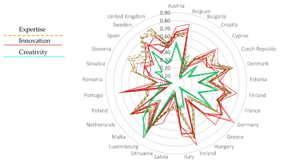 Creativity and knowledge generate invention, which, with respect to managerial competence, generates innovation. Thus, knowledge is measured in the share of population that completed tertiary education and the number of new doctorates (indicators used as inputs in innovation measurement in [47,70]), share of enterprises providing ICT training (information and communication technologies, used also as an innovation variable in [71]), medium and high-tech product exports and households with ICT. The main reason of constructing knowledge with these inputs is to outline knowledge and leading-edge technology appropriateness such as access to information (ICT, tertiary education, doctorates) and technology (medium, high tech products exports).
