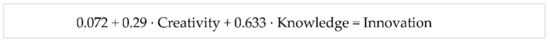 To sustain the model, a multiple linear regression was performed, in which the dependent variable was innovativeness and the independent variables were creativity and knowledge. The level of significance considered was of 95%, thus considering the usual α value of 0.05. The regression was pursued in SPSS, using simple least squares method. Data distribution was normalized using log normalization method. The missing data was estimated using interpolation. All data was public, and no personal consent was needed.