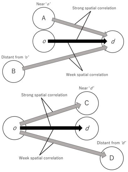Figure 1 depicts the theoretical implications of spatial weights on migration flows (). The origin-based matrix () assigns greater weight to “flows to d from areas close to o” than to “flows to d from areas remote from o”. Therefore, is a variable that captures the stronger spatial correlation between flows that originate from nearby areas. Similarly, the destination-based matrix () assigns greater weight to “flows to areas near d” than to “flows to areas distant from d”. Thus, is a variable that captures the stronger spatial correlation between flows to nearby destinations.