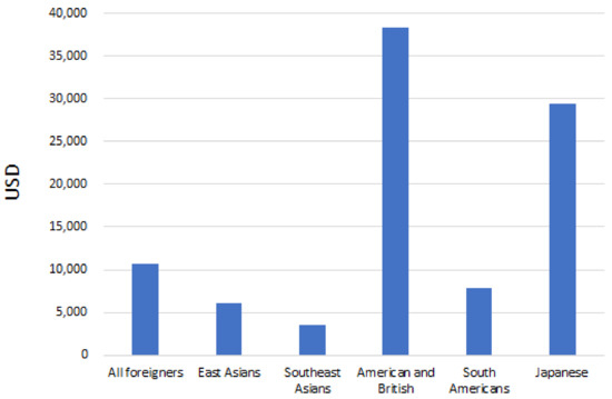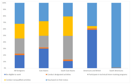 According to the Ministry of Health, Labour, and Welfare (MHLW), foreign workers in Japan can be categorized as per the following employment status typology: those who (1) are eligible to work, (2) conduct designated activities, (3) participate in technical intern-training programs, (4) conduct non-qualified activities, and (5) stay based on their status. People who stay based on their status include permanent residents and those married to Japanese. Under the status of “designated” activities, foreign nationals are permitted to work only in activities designated by the Ministry of Justice. In 2019, the distribution of foreign workers among the five categories was approximately 20%, 2%, 23%, 22%, and 32%, respectively. Many foreigners from the United States, the United Kingdom, and South Korea, most of whom are relatively wealthy, are employed in professional and technical fields. Filipino, Brazilian, and Peruvian individuals tend to be permanent or long-term residents. Many people from Brazil and Peru are Japanese descendants, and many Filipinos have obtained permanent residency through intermarriage with Japanese people. The majority of Nepali immigrants are engaged in non-qualified activities with student status. The proportions by employment type are illustrated in Figure 3. These suggest significant differences in employment status by country groups that are used in the subsequent analysis: the East Asian Group (Korea and China), the Southeast Asian Group (Vietnam, the Philippines, Indonesia, and Nepal), the South American Group (Brazil and Peru), and the Western Group (the United Kingdom and the United States).