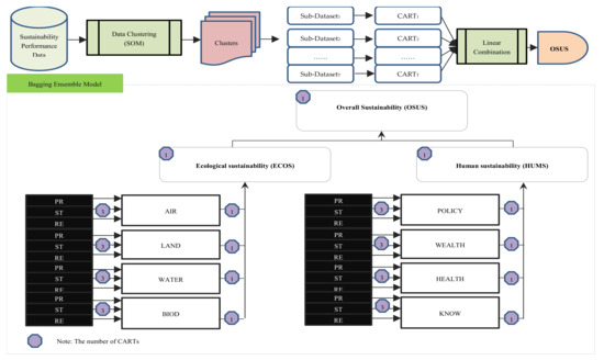 - A supervised learning technique was implemented to construct prediction models. These models were used to determine the level of sustainability. Furthermore, the CART technique, which is based on the regression and classification approaches, was applied so that an accurate evaluation of sustainability performance through a set of real-world data was gained. The CART models were developed for ensemble learning. To the best of our knowledge, ensemble learning approaches have not been used extensively to assess sustainability performance.