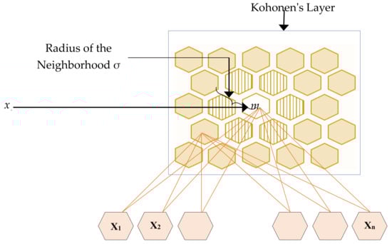In SOM, the inputs in the dataset are projected onto the neural net, with connections between the neurons, in the cortical area. In fact, in SOM, output neurons of the model are interconnected in a lower-dimensional space within a defined neighborhood (see Figure 2). In SOM the following main steps are performed: