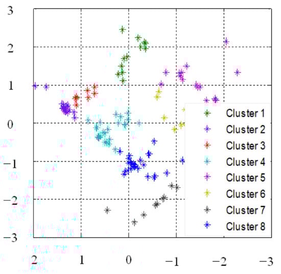 This study aims to measure country sustainability performance by implementing the SOM and CART techniques through a set of input indicators in the SAFE dataset. SAFE data were used to assess the used method. Figure A1 and Figure A2 in Appendix A present the sustainability data of 128 countries based on ECOS and HUMS. It could be seen from the figures that, similar to ECOS and OSUS, HUMS and OSUS were correlated to each other. Furthermore, societal/human sustainability and ecological sustainability levels were also determined. The first step of this study was the clustering of data into several classes using SOM. In this process, different SOM sizes were tested, and the best number of clusters was selected based on the SOM map quality. To be specific, an attempt of using SOM 2 × 2, SOM 2 × 3, SOM 2 × 4, and SOM 3 × 4 was done for SOM clustering. Meanwhile, Figure 3 displays SOM 2 × 4 clustering results, as the accuracy value of SOM 2 × 4 (8 clusters) clustering was higher compared to the accuracy of other SOM.