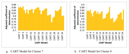 The accuracy of all CART models for the eight clusters of SOM could be seen from Figure 5a–h. From the results, it is noticeable that the CART’s prediction modules have provided high values in all clusters. Accordingly, this technique could be useful for effectively modeling the tools used for sustainability performance evaluation.