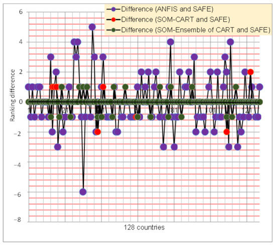 This research also applied the bagging approach as one of the most popular ensemble methods to obtain final results. This was performed through aggregating and bootstrap resampling methods. Through bagging bootstrapped, replicas of original data in the clusters were derived and with replacement from the training dataset, different training sub-datasets were randomly drawn. Accordingly, through this procedure, different prediction models were generated and applied for the prediction of the entire data from the subsets. Finally, using the aggregation approach [57], various estimated models were aggregated for final results. In this research, for ensemble learning, a CART model was built through a procedure that is repeated 20 times to get 20 individual forecast models in each cluster. Each of these prediction models was used to predict the output and finally, the linear combination of these predictions was used as the final prediction result. The results for SOM+Ensembles of CART, CART [32], Adaptive Neuro-Fuzzy Inference System (ANFIS) [32], Neural Network (NN) [32], Multiple Linear Regression (MLR) [32], Fuzzy C-Means + CART [32], and Fuzzy C-Means + ANFIS [32] techniques are shown in Table 2. The results of this study’s analysis revealed that the combination of SOM and CART techniques with the aid of ensemble learning resulted in a more superior performance compared to CART, ANFIS, NN, MLR, Fuzzy C-Means + CART, and Fuzzy C-Means + ANFIS in the measurement of country sustainability performance. As shown in Figure 6, the final results showed that minor differences were present between SAFE and the proposed method for the country sustainability rankings (see Table A8 in Appendix B).