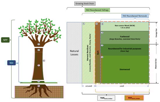 A systematic overview of the allocation of tree components to use categories and the respective terminology commonly used in national and global forest inventories [,,], material flow analysis indicators [,,] and plant ecology [] is presented in Figure 1.