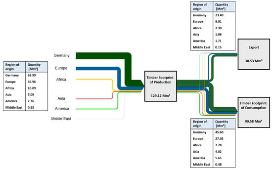 The Timber Footprint of Consumption (TFPcon) is obtained by adding the mass of extracted roundwood within the national territory to the quantity of RE extracted abroad to satisfy the domestic consumption of products and services, and then deducting the quantity of domestically extracted RE used for export. Without the deduction, the Timber Footprint of Production (TFPp) is obtained, which quantifies the total throughput of RE of the German production system.