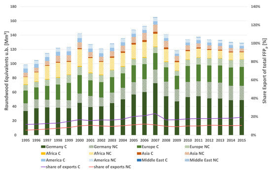 The Timber Footprint of Production (TFPp) shows a strong increase in the first five years of the examined period, while in the following years, we observe a fluctuating trend caused by severe storm events. The mean is around 136 Mm3 between 2000 and 2015 (Figure 3). In 1995, the export has a share of 17% of the total footprint of production, which doubles in the next decade. Between 2005 and 2015, exports remain at around 30% of the total footprint of production. Germany becomes more export-oriented in the total examined period, with an export increase by around 130%. The resource productivity (GDP/Resource Input) increases by around 30% within this timeframe—presumably driven by increased exports.