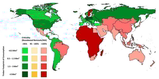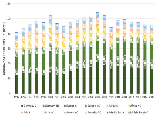 In this study, the indicator Timber Footprint of German final consumption of roundwood equivalents (TFPcon) is chosen, which allows quantification of the RE sourced from within and outside Germany and a subsequent assessment of the respective region of origin. This article shows the development of the Timber Footprint of Germany from 1995 to 2015, identifying the source countries, and respective quantities, which originate from these countries. Two different methods are used to assess the sustainability of the respective source regions of final RE consumption in Germany. The first method uses statistical information from international reports such as the Global Forest Resource Assessment [], The State of Europe’s Forest Report [,] to calculate the country- or region-specific ratio of annual roundwood removal to annual net increment. This “forest utilization rate” is a common indicator reported, for example, by the EEA []. The second method combines spatially explicit information on annual forest area loss [], growing stock volume [] and the underlying dominant driver of forest loss [] to calculate the amount of roundwood gained from deforestation and clearcutting practices that serves as a proxy for high environmental impacts.