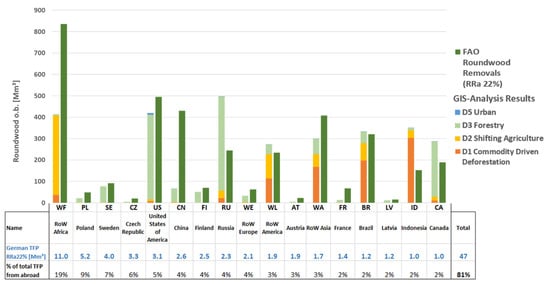Comparison of procured roundwood o.b. on deforested and clear-cut areas (GIS analysis) with officially reported roundwood removals (FAOSTAT) of the 17 largest suppliers to the German TFPcon from abroad, averaged from 2010 to 2015. The dark green column shows the official data from FAOSTAT adjusted for bark and harvest losses with RRa 22%. The stacked columns show the result of the GIS analysis combined with the deforestation and clear-cut driver information from Curtis et al. []. The underlying data can be found in Supplementary Information IV.