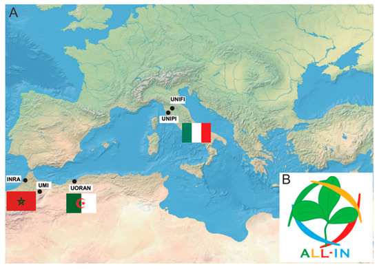 (A) Countries involved in the project (UNIFI = University of Florence, Italy; UNIPI = University of Pisa, Italy; UORAN University Oran1, Algeria; INRA = National Institute of Agricultural Research (INRA), Morocco; UMI = Moulay Ismail University, Morocco). (B) ALL-IN (ALfalfa for sustainable Livestock farming systems: Improve alfalfa–rhizobia symbioses and New feeding strategies based on ecological leftovers) logo.