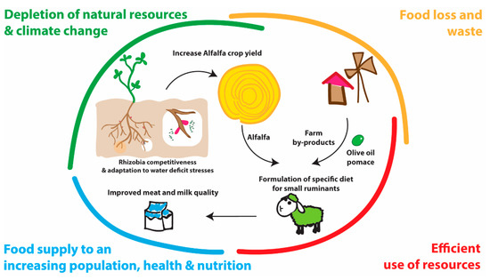 In the past 10 years, the average demand for meat and milk across the world has significantly increased, especially in developing countries. Therefore, to support the production of animal-derived food products, a huge quantity of feed resources is needed. This paper does not present original research, but rather provides a conceptual strategy to improve primary production in a sustainable way, in relation to forthcoming issues linked to climate change. Increases in meat and milk production could be achieved by formulating balanced diets for ovines based on alfalfa integrated with local agricultural by-products. As the central component of the diet is alfalfa, one goal of the project is increasing the yield of alfalfa in a sustainable way via inoculating seeds with symbiotic rhizobia (i.e., Sinorhizobium meliloti). Seed inoculants are already present on the market but have not been optimized for arid soils. Furthermore, a part of the project is focused on the selection of elite symbiotic strains that show increased resistance to salt stress and competitiveness. The second component of the experimental diets is bio-waste, especially that obtained from olive oil manufacturing (i.e., pomace). The addition of agro-by-products allows us to use such waste as a resource for animal feeding, and possibly, to modulate rumen metabolism, thereby increasing the nutritional quality of milk and meat.