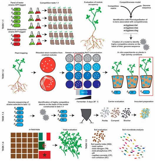The genome of rhizobial strains selected in Task 1.2 will be fully sequenced. The model obtained in Task 1.1 will be used to infer which strains have highly competitive capabilities. Strains characterized by high nitrogen fixation efficiency in water-stress conditions and high competitiveness will be selected and used as inoculants for in field experiments. Inoculants will be produced in a pilot fermenter at 28 °C for about five days. The growth of the inoculant will be followed by centrifugation at 8000× g to increase the inoculum concentration by one order of magnitude. Three different carriers will be evaluated: perlite, compost, and biochar from pyrolysis. For inoculum preparation, all the carrier materials will be ground, passed through an 80 mm sieve, and autoclaved. The inoculum obtained, as indicated above, will be combined with recognized cell protector consisting of 1% locust bean plus 1% trehalose (weight:volume). The cellular suspension will be uniformly and septically mixed with the carrier. After the preparation, the inoculum will be immediately transferred to 4–6 °C.