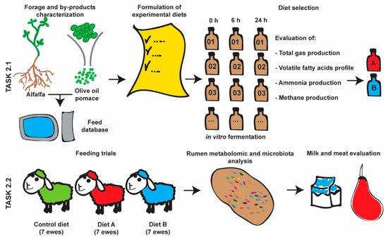 A detailed nutritional evaluation of legume forage alfalfa and by-products obtained from food production and processing will be conducted to identify nutritional complementarities. Olive oil pomace will be used in the project since it is widely produced in the Mediterranean area and can modulate rumen metabolism due to its high polyphenolic content [34].