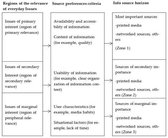 There is a sizeable amount of literature focusing on everyday life information seeking (ELIS) of individuals and groups from different contexts (e.g., investors, historians, grocery shoppers). Similarly, several studies have investigated the ELIS of students [9,10,12]. Some studies have focused on the role of the internet, news, and social media in the ELIS of students [9,11,12,25], while others focused theoretically on ELIS [24,26,27,28]. Savolainen [24] approached ELIS more broadly and argued that work and non-work (job related) information seeking overlapped and could not be separated. Given [27] identified an overlap between academic and everyday information needs and reported that students’ everyday experiences also informed their academic activities (students’ chosen assignment topics related to their part time occupation), which reinforced Savolainen’s framework. More broadly, Savolainen [26] discussed two approaches to ELIS: seeking orienting information and seeking problem-specific information. Problem-solving information refers to information needed for solving a problem or completing a task whereas orienting information relates to information about everyday events. Savolainen [26] also developed a framework by combining concepts of regions of relevance [29] and information source horizon [30], and added a third component of source preference criteria to examine the seeking of orienting information of environmental activists (Figure 1). According to Schutz and Luckman [29], there are four major regions of relevance: the world within our reach is the primary region of relevance, the world within our potential reach is the second region of relevance, relatively irrelevant regions, and irrelevant regions. They were of the view that people structure their everyday life based on their interests. Sonnenwald [30] introduced the concept of an information horizon that can consist of a variety of information sources with which all of us can interact.