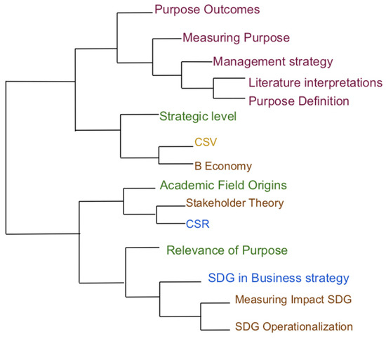 We found a clear pattern in the literature that connects Corporate Purpose to corporate identity (see [24,75,76,78,79]). In his work, Hurst [14] introduces the term “purpose economy”, focusing on the power of stakeholder engagement to improve companies’ performance and communities’ well-being. Other authors [5,7,14] emphasize that “Corporate Purpose” is the foundation for organizational culture.