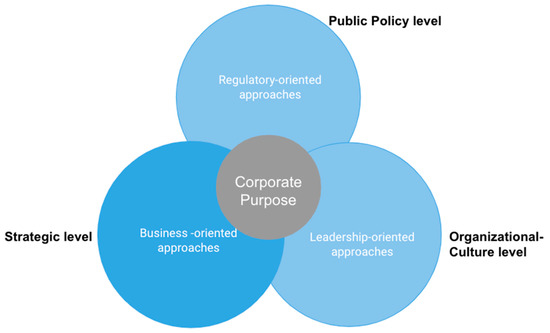 First of all, regulatory-oriented approaches encourage institutional design around purpose and a structural reconceptualization on legal and financial aspects of business [6,18,67,71]. Particularly, in concepts such as ownership, governance, performance measurement, and management incentives. In regulatory-oriented approaches, scholars argue that governments should take the lead on legal reform that sets a clear direction towards purposeful business, while the other two approaches focus mainly on shifts inside the corporation leaders and investors forge ahead in applying purpose principles. Secondly, business approaches see corporate purpose as a living strategy to optimize opportunities for developing business model innovations that contribute directly to societal wellbeing while making profitable business. They also focus on long-term revenue maximization.